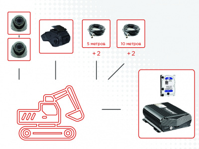 Готовый универсальный комплект системы видеонаблюдения для организации контроля на строительной технике и спецтранспорте. Это решение создано для мониторинга работы экскаваторов, бетономешалок, тракторов, эвакуаторов, кранов-манипуляторов, самосвалов и другой специализированной техники. Система обеспечивает полный обзор как внутри кабины, так и снаружи транспортного средства, включая его подвижные элементы.