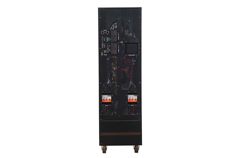 Установка UPS — напольная. Защита от влаги и пыли отвечает стандарту IP20. Рабочие температуры — 0 ºС… +40 ºС. Габариты — 250×828×868 мм. Вес — 56 кг.
