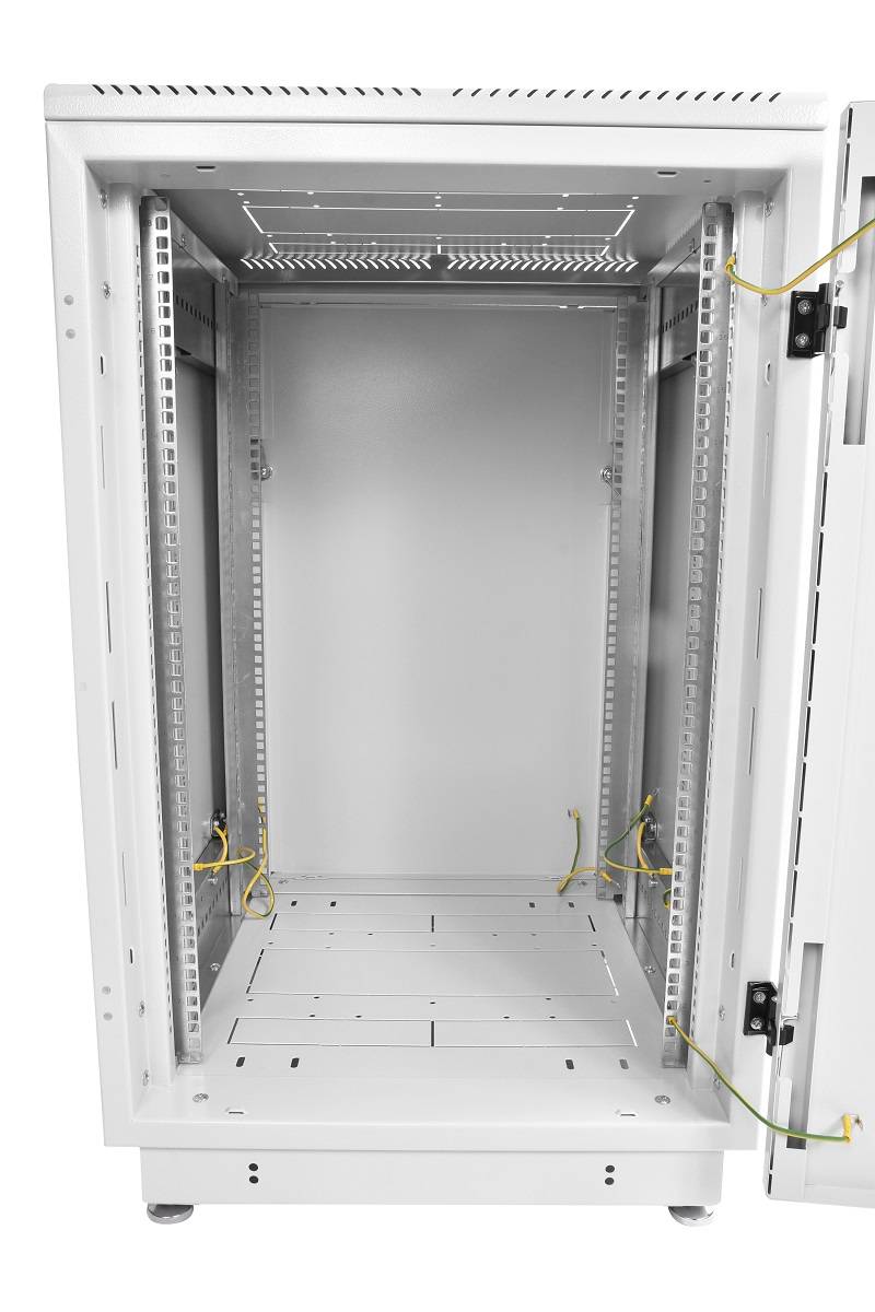 Шкаф поставляется с четырьмя винтовыми опорами, компенсирующими неровности пола. Общая площадь перфорации составляет 67 %. Размер шкафа — 600×800×1140 мм, вес — 61.74 кг.