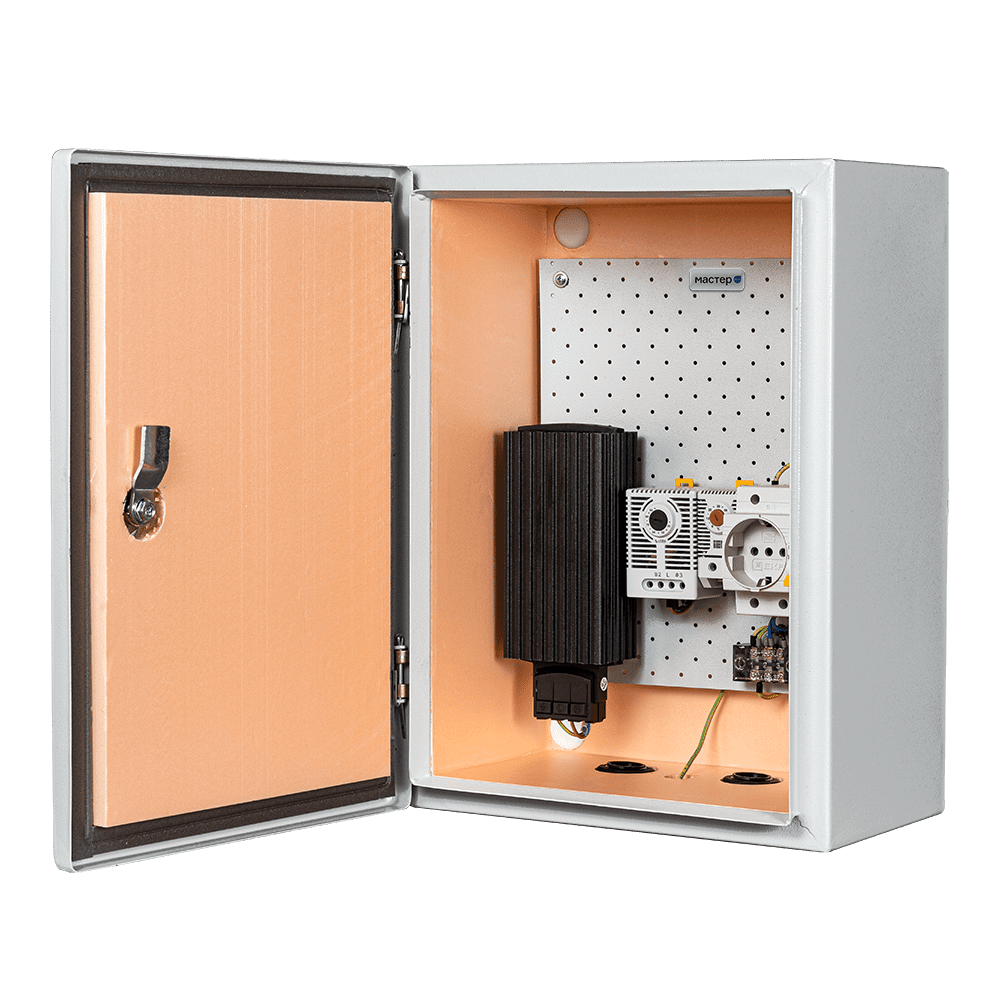 Электротехнический шкаф Mastermann «Мастер 2 УТ-Г» адаптирован к уличной эксплуатации в любых климатических условиях при температурах –55 °С… +50 °С. Отвечает требованиям ТУ 4372-002-62942652-2016, соответствует классу I по ГОСТ 12.2.007.0 (защита от поражения электрическим током), IP66 по ГОСТ 14254-96, ГОСТ 15150-69. Оборудован автоматической системой поддержания температуры и влажности: механическим гигростатом NT 74-F, контролирующим уровень влажности, обогревателем HG 140 мощностью 75 Вт, автоматическим выключателем 10 А, нормально закрытым термореле KTO 011. Оборудование установлено на DIN-рейку. Предусмотрены DIN-розетка с заземлением, два гермоввода MG-25, клеммная колодка.