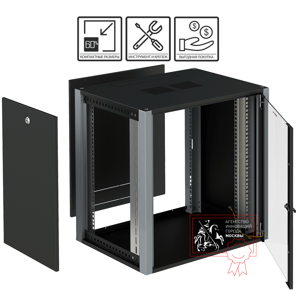 Листовые детали шкафа покрыты предварительно фосфатированной полимерной порошковой краской. Цвет листовых деталей - сигнальный черный (RAL 9004), стоек - "серая белка" (RAL 7000). Уровень защиты IP20. Габариты: 600×450×450 мм. Вес: 17.3 кг.