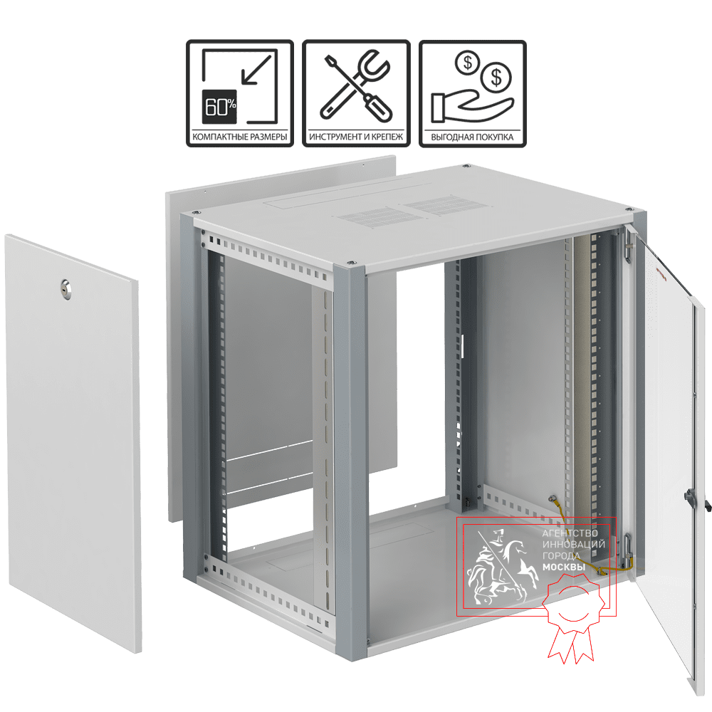 Покрытие листовых деталей — предварительно фосфатированная полимерная порошковая краска светло-серого (RAL 7035) цвета, стойки — цвета серой белки (RAL 7000). В комплектацию включены крепежные элементы и отвертка. Защита — IP20. Размер — 600×450×315 мм. Вес — 14.5 кг.