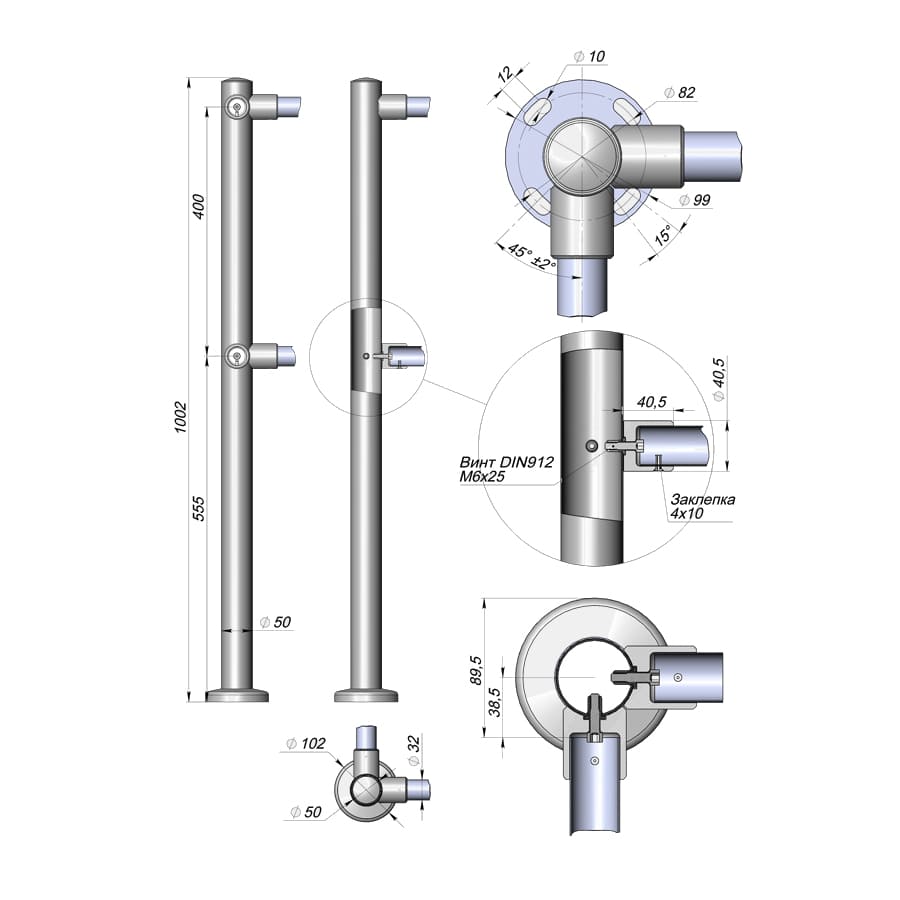 Стойка вертикальная 3V СВУ предназначена для образования угла в периметре из секций модульного ограждения 3V. Стаканы для крепления поручней в комплект не включены.Четыре гайки-заклепки для крепления стаканов расположены под углом 90° друг к другу — в двух уровнях по две штуки; расстояние между гайками по высоте — 400 мм.
