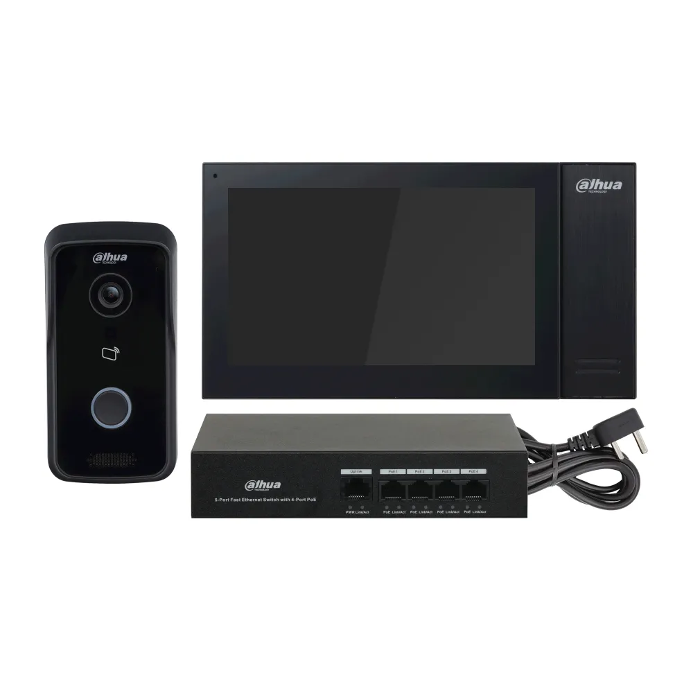 Представленный комплект IP-видеодомофона включает в себя одну вызывную панель DHI-VTO2111D-P-S2, один домофон DH-VTH2421FB-P и один PoE коммутатор DH-PFS3005-4ET-36.